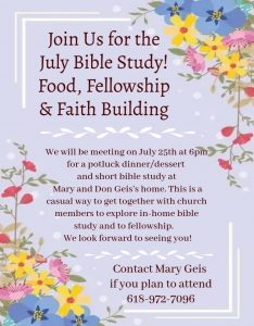 Summer Evening Bible Study July 25, 2025 6:00 pm Food, Fellowship, and Faith Building Join us for a Summer Bible Study (& Potluck Dinner!) on Friday evening — July 25th at 6PM. Please contact Mary Geis or the church office for details.